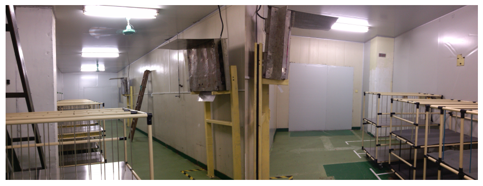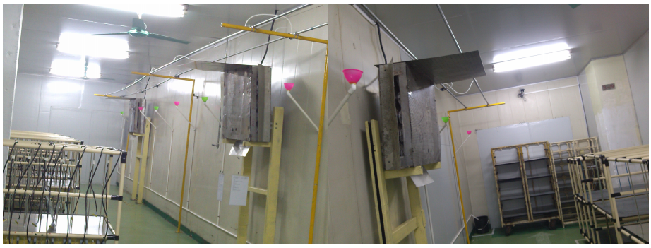 在平板電視老化測(cè)試房里面要通過(guò)噴霧加濕的方式來(lái)達(dá)到特定濕度,溫度保持在50±5℃,濕度要達(dá)到65%-85%,現(xiàn)房間濕度在40%左右,房間里面有四臺(tái)吊扇在工作,房間尺寸為22m(長(zhǎng))*3.31m(寬)*3m(高),房間隔成兩半,一邊長(zhǎng)度在6m 左右,另一邊長(zhǎng)度在16m,大房間里面有兩臺(tái)加熱器、三臺(tái)吊扇,小房間一臺(tái)加熱器、一臺(tái)吊扇,放平板的架子最高高度在1.4m 左右。