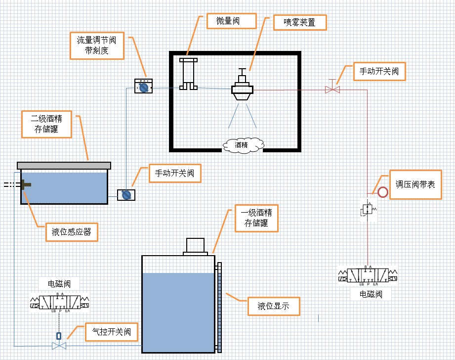 美泰噴霧的指派了專業(yè)的銷售工程師和應(yīng)用工程師深入一線了解了客戶的真實需求,并帶回樣品進行實驗室測試。初步結(jié)果論證之后,結(jié)合客戶的實際工況,設(shè)計了一套模塊的噴霧系統(tǒng)。系統(tǒng)采用了美泰噴霧定制的雙流體噴嘴,可以實現(xiàn)精準(zhǔn)噴霧,并且實現(xiàn)了防滴漏的功能。根據(jù)帶速的不同,該噴霧系統(tǒng)可以實現(xiàn)噴霧流量的實時調(diào)整。針對酒精補充的問題,設(shè)計了兩級存儲系統(tǒng),既保證了酒精補充的便捷,也保證了系統(tǒng)供液的穩(wěn)定性。