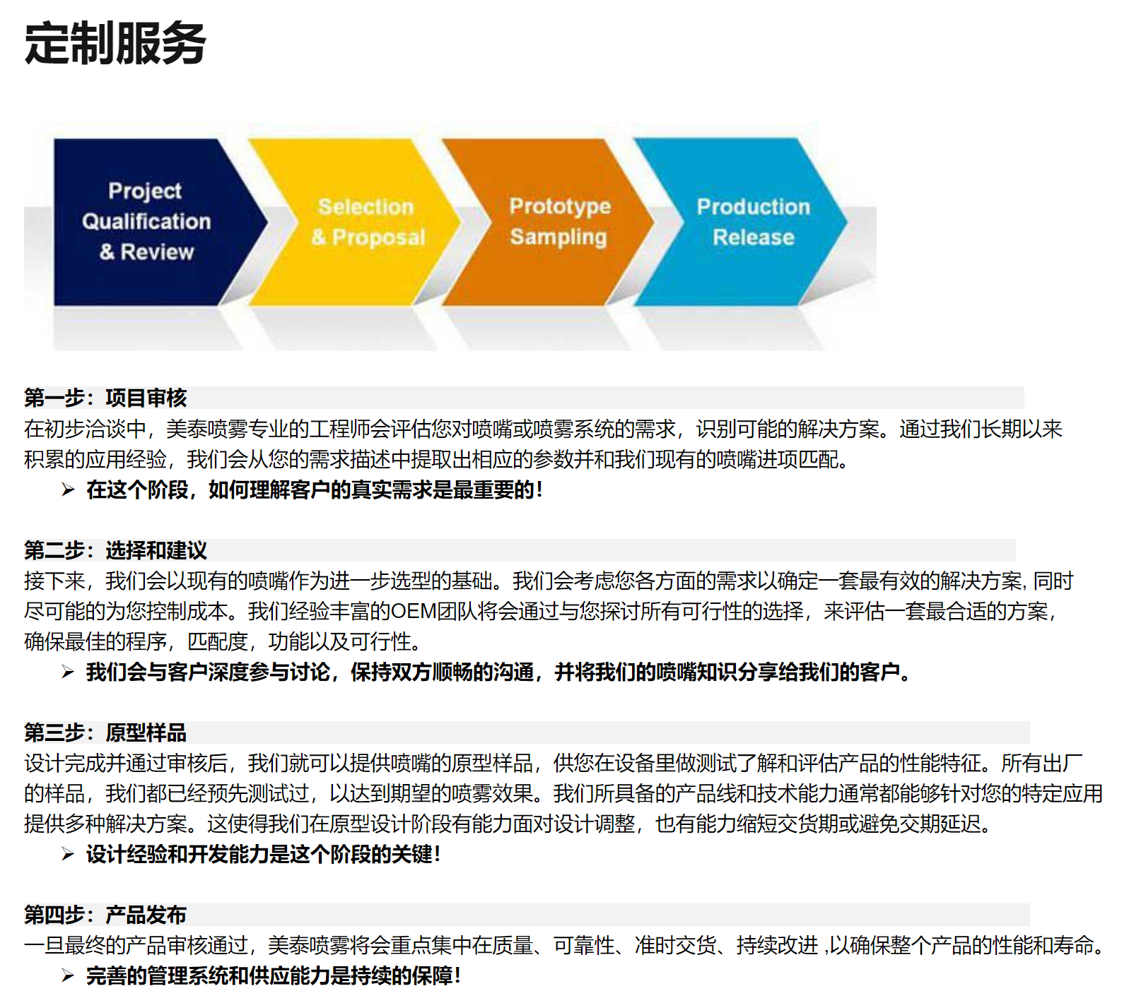 美泰噴霧的宗旨是為客戶提供卓越的噴霧解決方案!在定制服務(wù)領(lǐng)域,我們嚴(yán)格遵循著定制服務(wù)流程,從問題提取,方案制作,到實施跟進,我們都與客戶一起以問題解決為導(dǎo)向,通過我們的經(jīng)驗和理念,與客戶一起分享信息,共享知識。